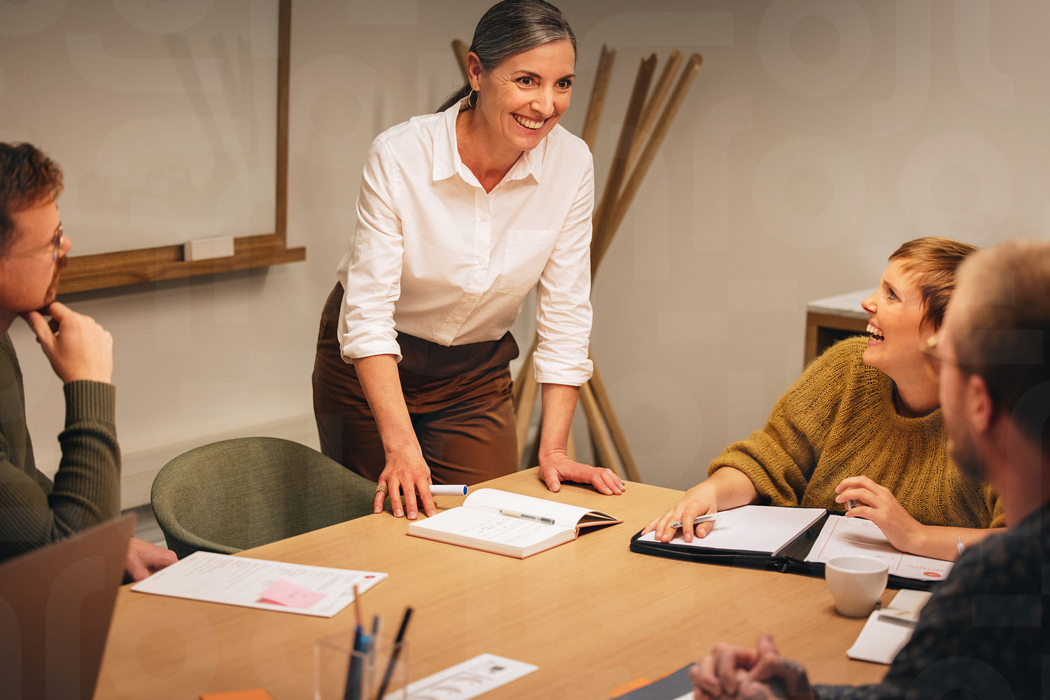 Smiling businesswoman talking with team and smiling during meeting. Group of business professionals having a meeting in office boardroom.