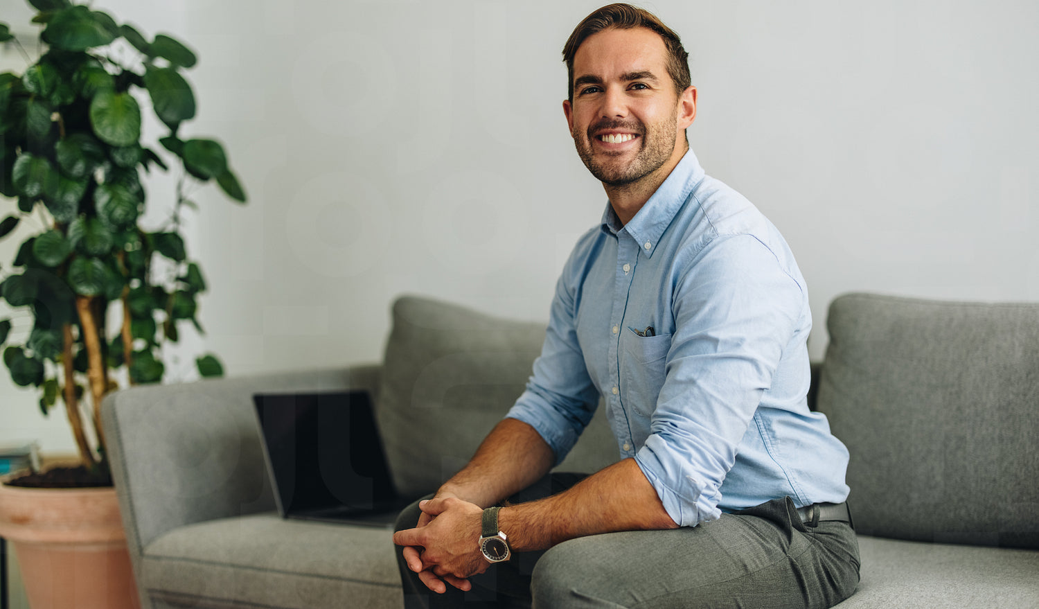 Confident businessman on sofa in lobby. Successful freelancer looking at camera and smiling in office.
