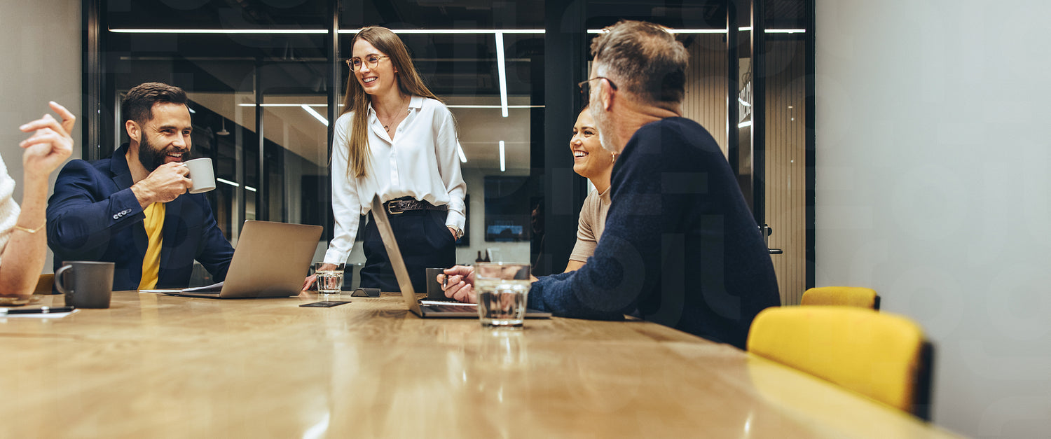 Successful businesspeople having a meeting in a boardroom. Group of happy businesspeople smiling cheerfully while working together in an office. Team of diverse colleagues collaborating.