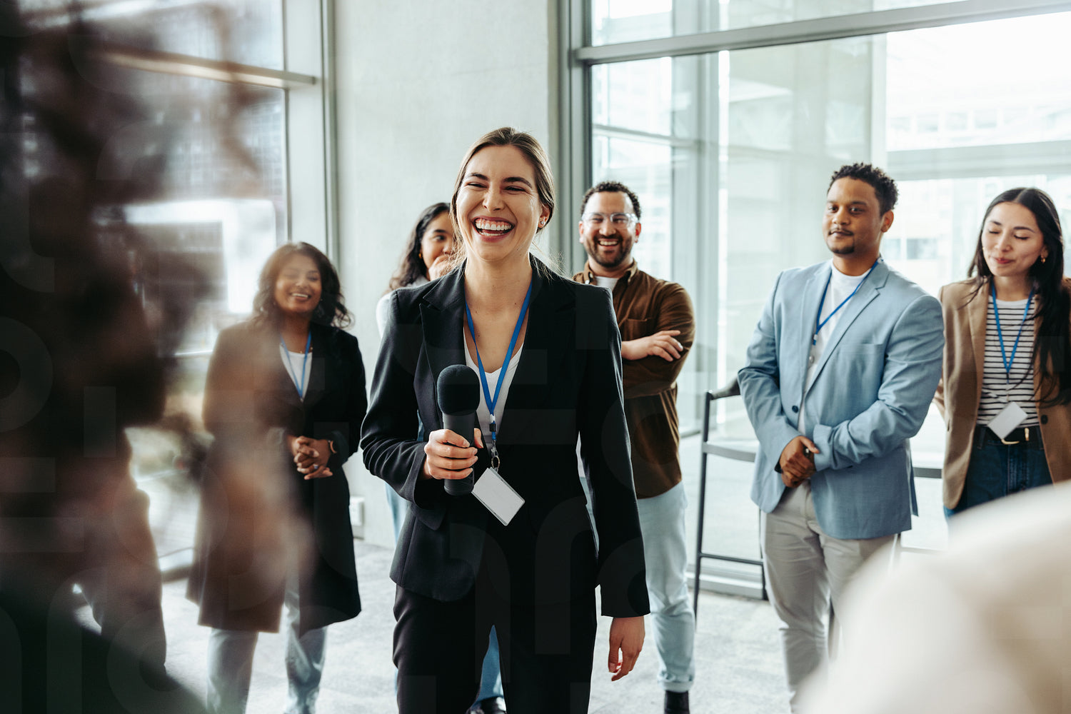 Confident businesswoman with microphone addressing diverse colleagues in a modern office environment. Team members smiling and engaging during the professional meeting.