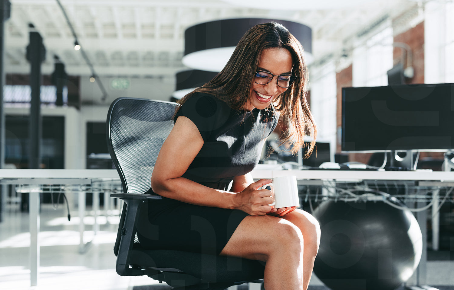 Black businesswoman laughing in a modern office. Happy young businesswoman holding a cup of coffee while sitting on a chair at work. Young businesswoman celebrating her success.