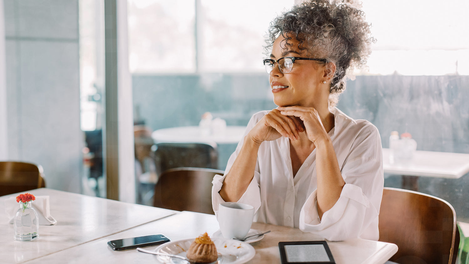 Successful businesswoman looking away thoughtfully while sitting alone in a cafe. Happy mature businesswoman smiling while thinking of new ideas during lunch.