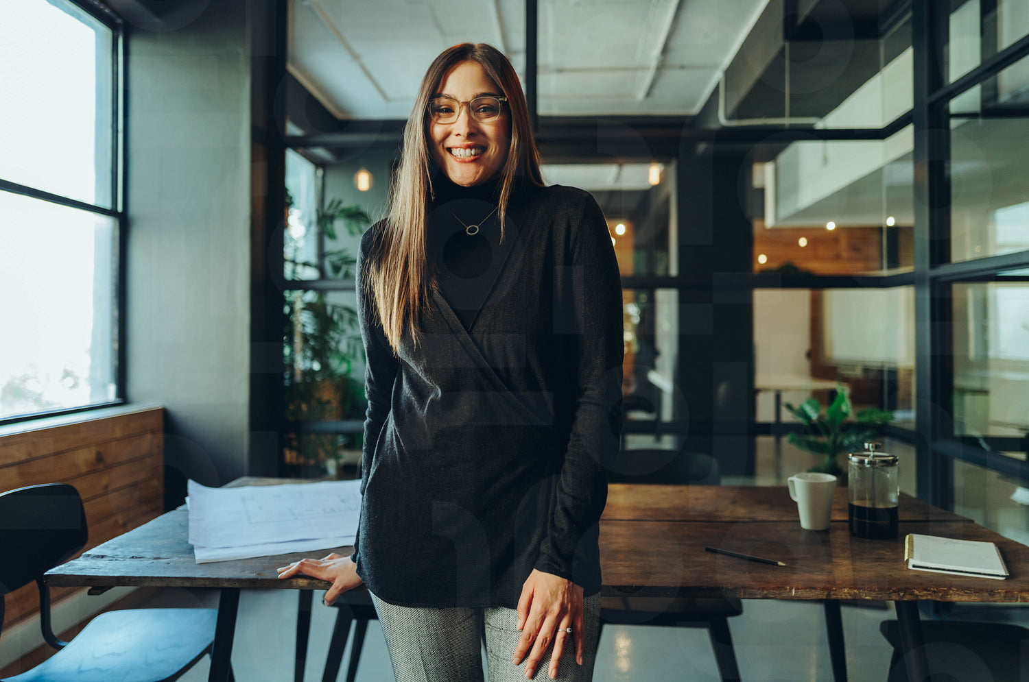 Successful female entrepreneur smiling at the camera while standing in an office. Happy young businesswoman standing in the boardroom of a modern workplace.