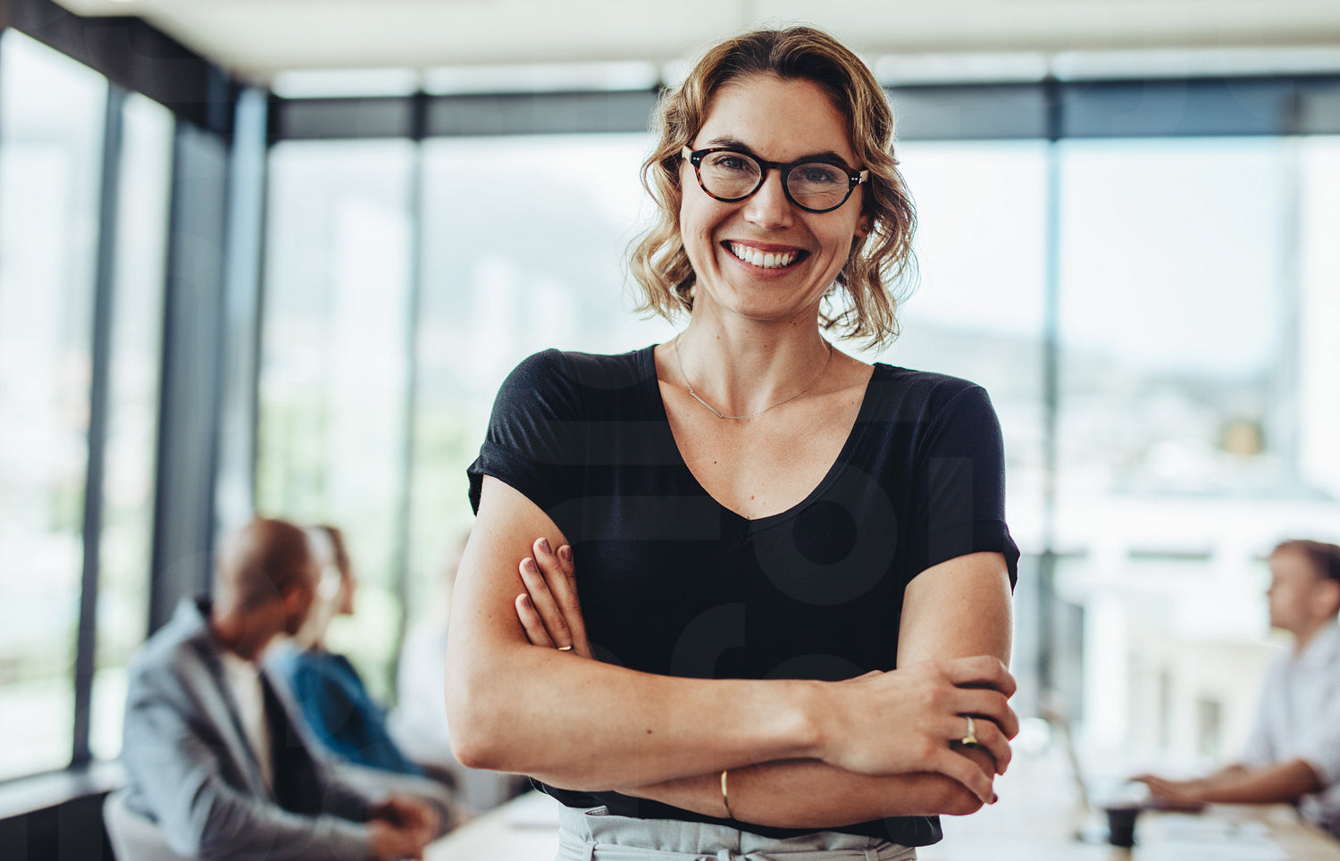Portrait of a successful businesswoman standing with her arms crossed looking at camera and smiling. Positive female professional with colleagues sitting in meeting room at the back.