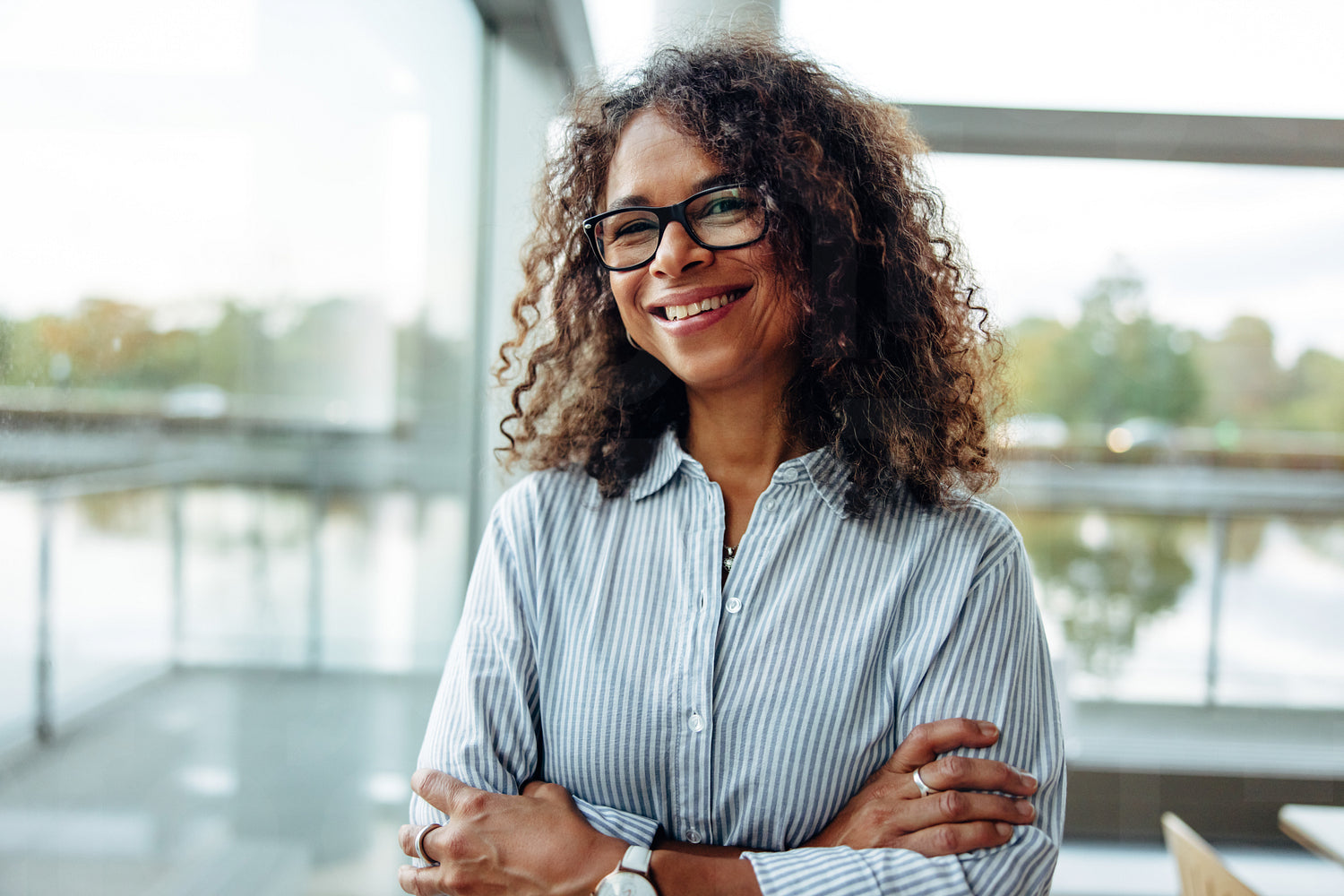 Portrait of female professional with curly hair wearing eyeglasses. . Smiling businesswoman with her arms crossed