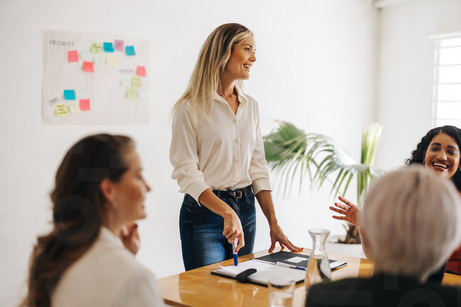 Successful businesswomen having a discussion during a meeting. Group of diverse businesswomen brainstorming in a boardroom. Happy businesswomen working together in an all-female startup.