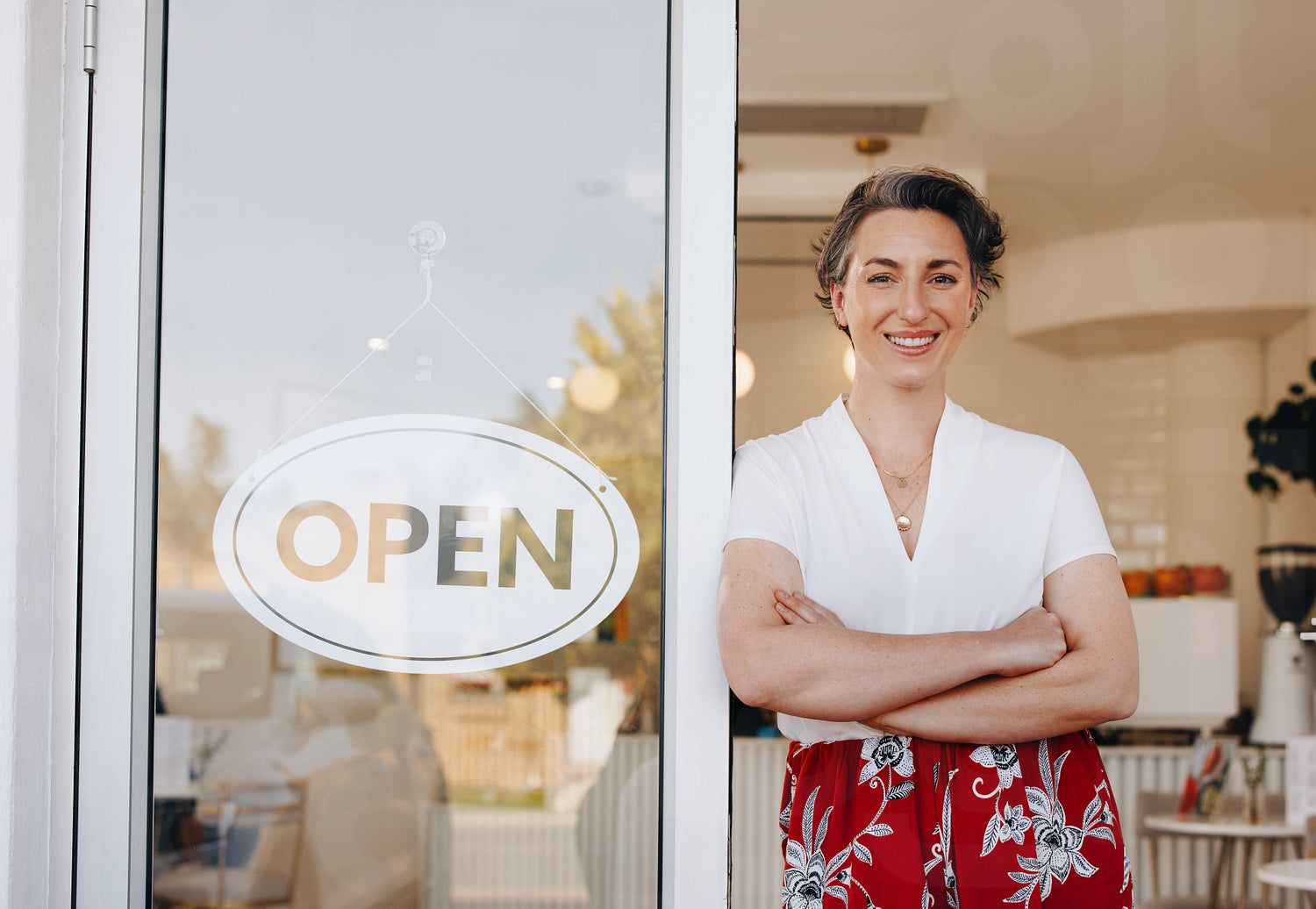 Successful cafe owner smiling while standing at the doorway of her newly opened restaurant