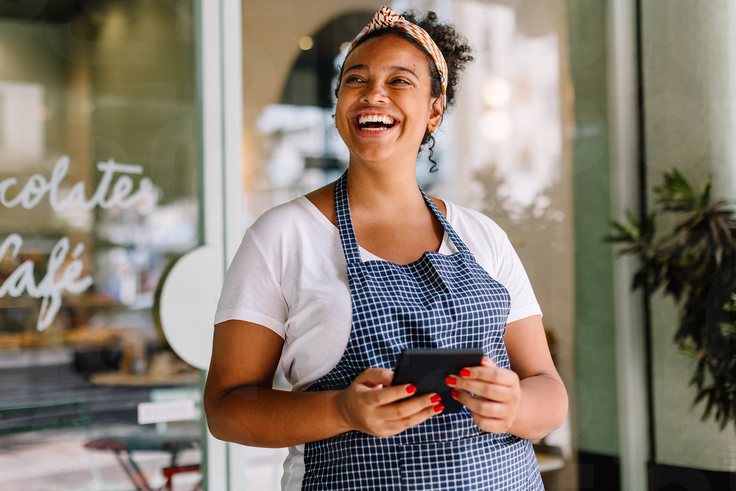Happy young entrepreneur embraces technology in a vibrant café, holding a digital tablet in hand. Female cafe owner stands confidently in her successful small business.