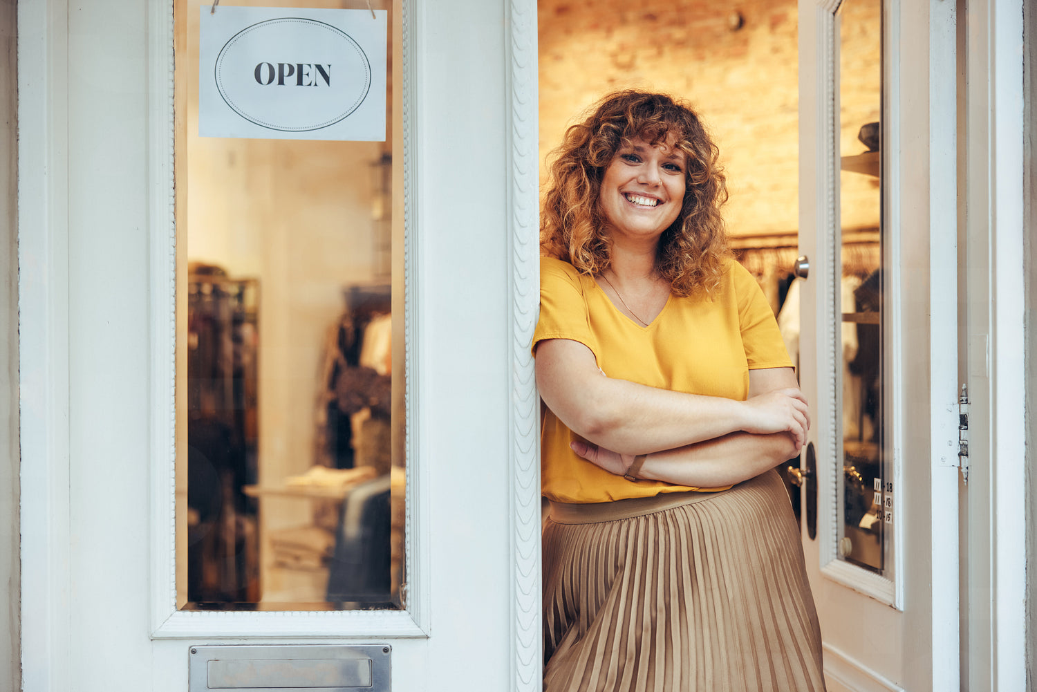 Portrait of a mid adult woman standing at doorway of her fashion boutique. Successful businesswoman standing at entrance door her shop looking at camera and smiling.