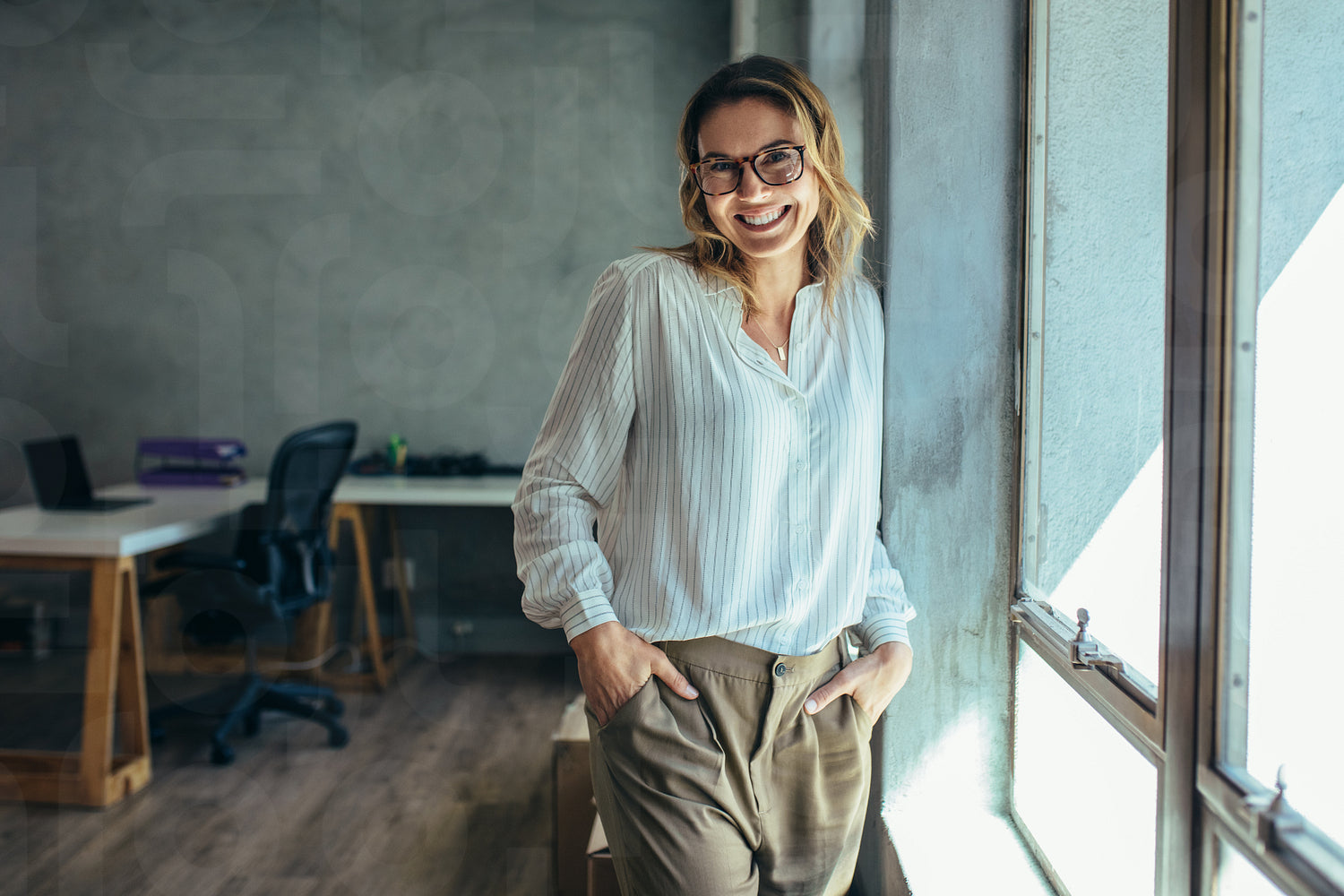 Successful female entrepreneur standing in office with hands in pocket. Businesswoman in casuals standing near window in office.