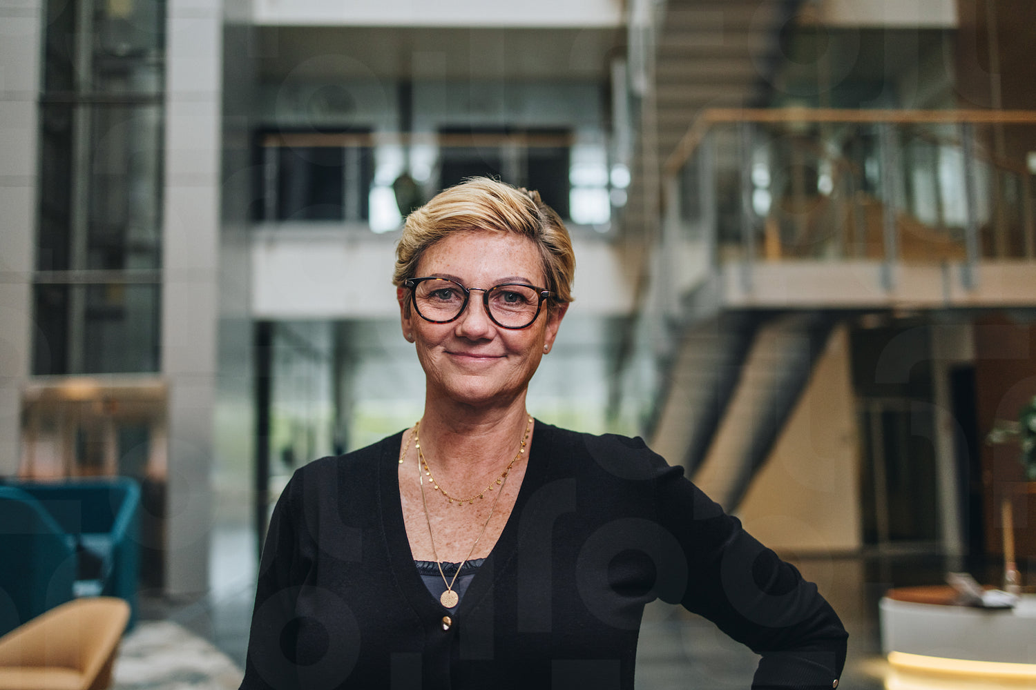 Portrait of successful entrepreneur standing in modern office. Female manager with eyeglasses looking happy.