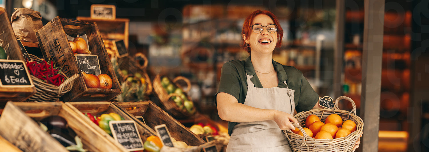 Successful grocery store owner smiling at the camera while holding a basket of fresh organic grapefruits. Happy female entrepreneur running a small business in the food industry.