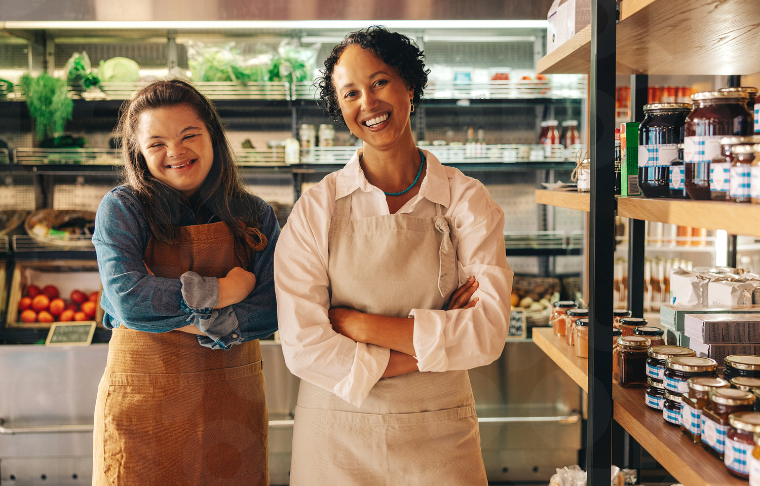 Successful grocery store workers smiling at the camera while standing together in their shop. Happy woman with Down syndrome working in a local supermarket with her female colleague.