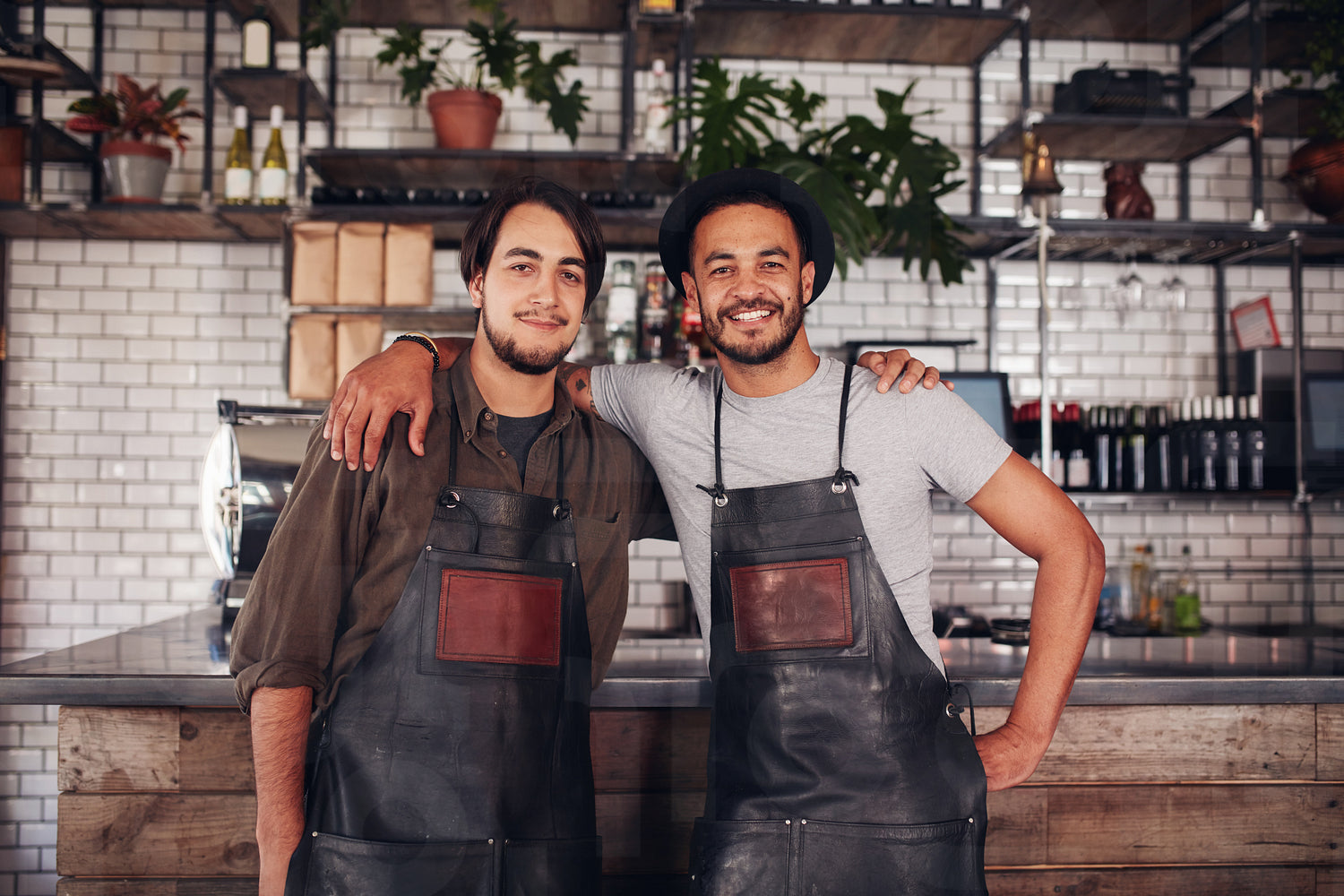 Portrait of two young coffee shop owners standing together at the bar counter and looking at camera.