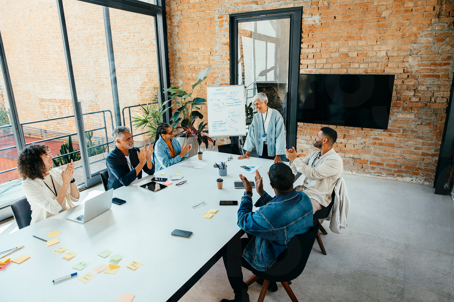 Successful meeting of diverse business colleagues engaged in a productive discussion around a bright, modern conference room