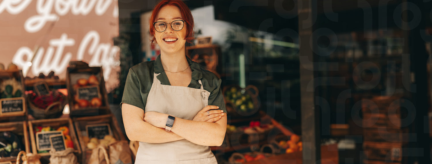 Successful supermarket owner smiling at the camera while standing in the fresh produce section of her grocery store. Happy young woman running a small business in the food industry.