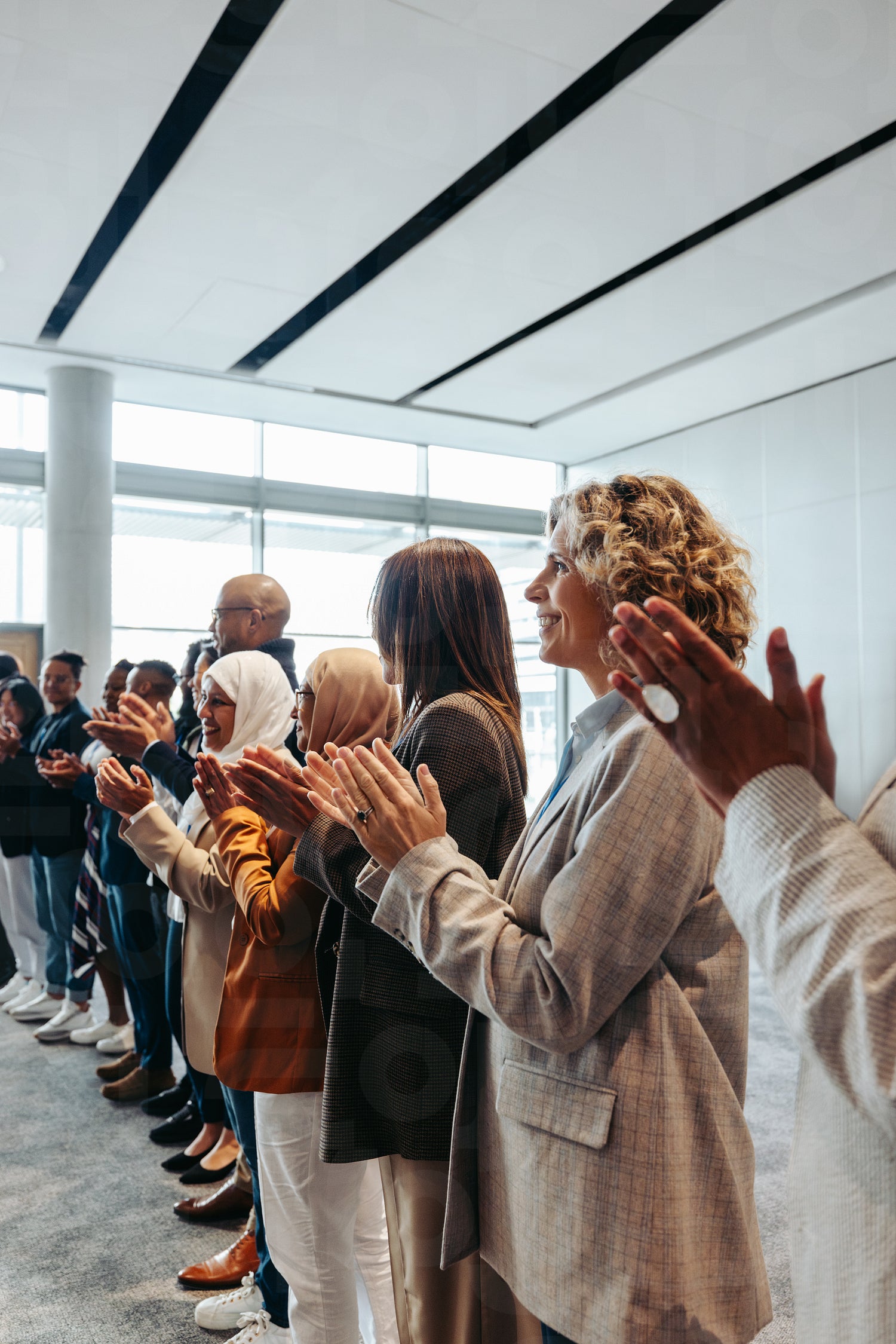 Successful and diverse team applauding during a workshop in a modern office setting. Colleagues expressing appreciation and teamwork.