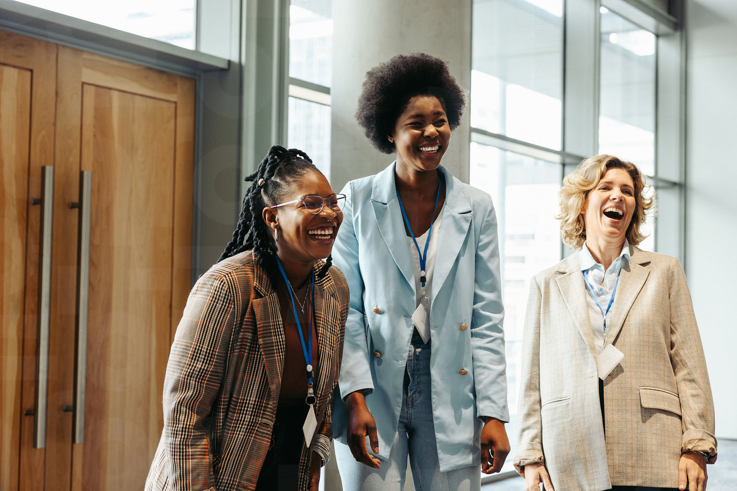 Female business professionals enjoying a successful team meeting, highlighting teamwork and collaboration in a contemporary office setting with a focus on positivity and success.