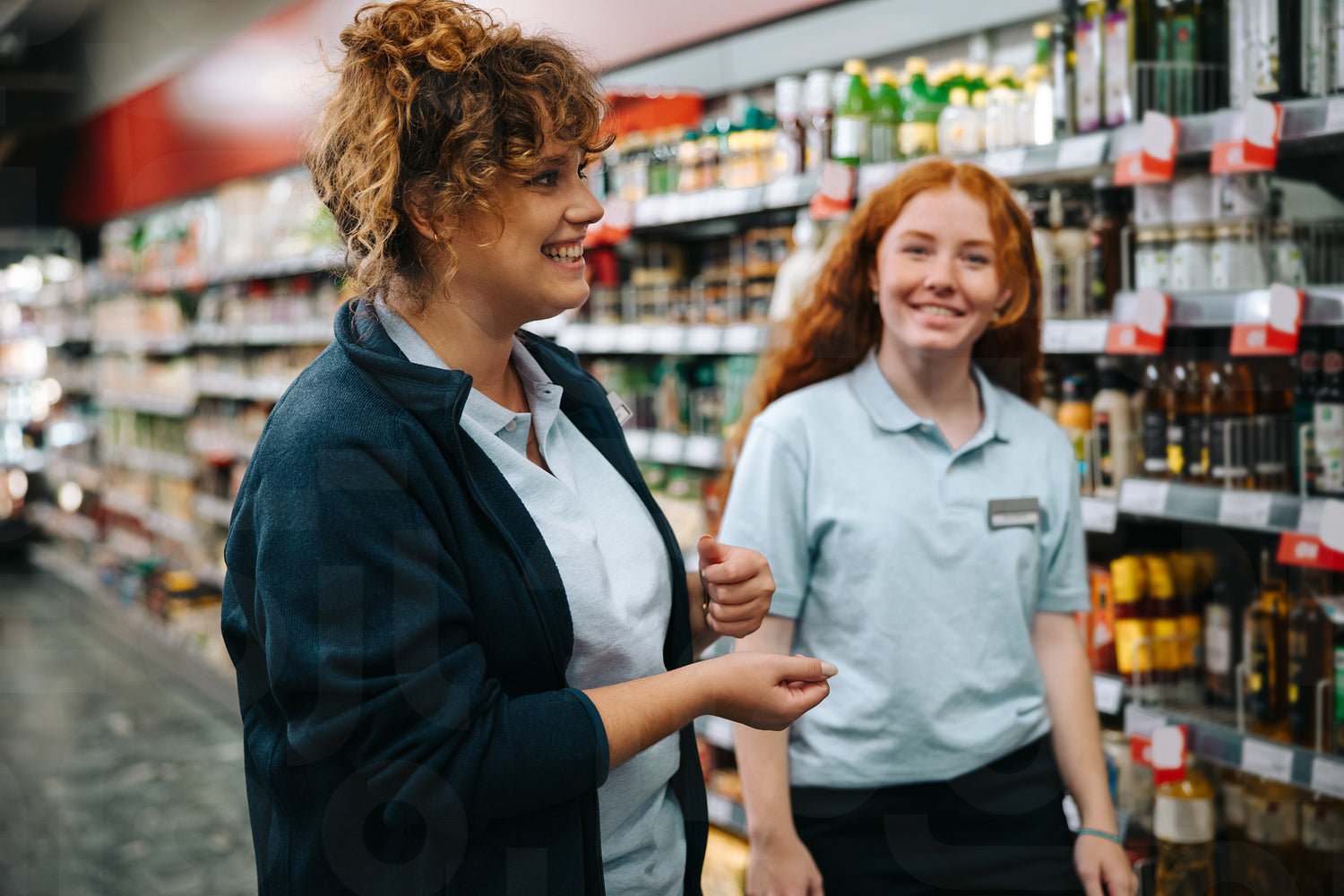 Trainer teaching customer service skills to a new female employee. Supermarket manager training young woman worker.