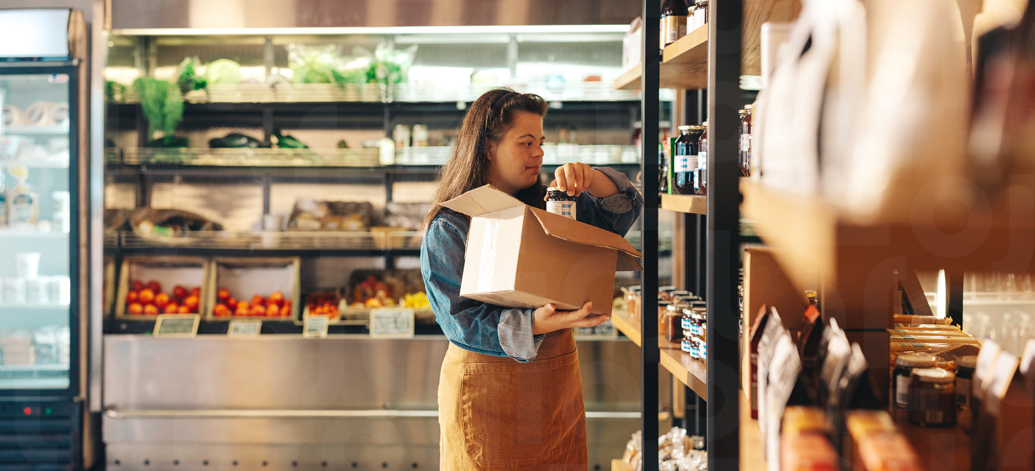 Shop employee with Down syndrome restocking food products in a grocery store. Empowered woman with an intellectual disability working as a shopkeeper in a local supermarket.