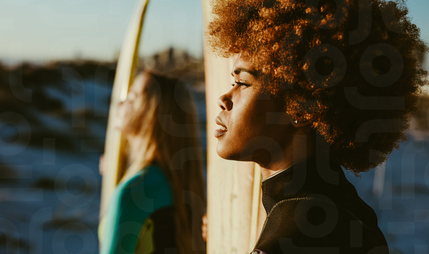 Close up of young african woman holding a surfboard and looking at the sunset with her friend standing at the back. Two women surfers on the beach at sunset.