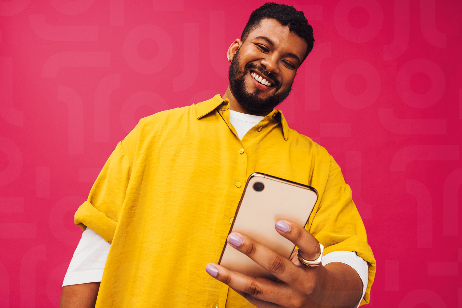 Surfing the net in the studio. Happy young man smiling cheerfully while using a smartphone to browse the internet. Carefree young man standing alone against a pink background.