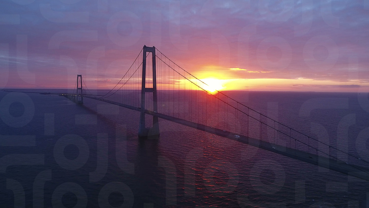 View of long suspension bridge on sea in Denmark. Storebaelt bridge with vehicles.