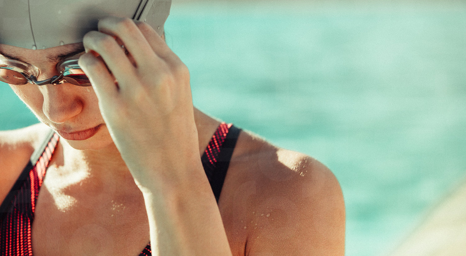 Close up of fit female swimmer adjusting her swim goggles. Professional swimming athlete getting ready for training.