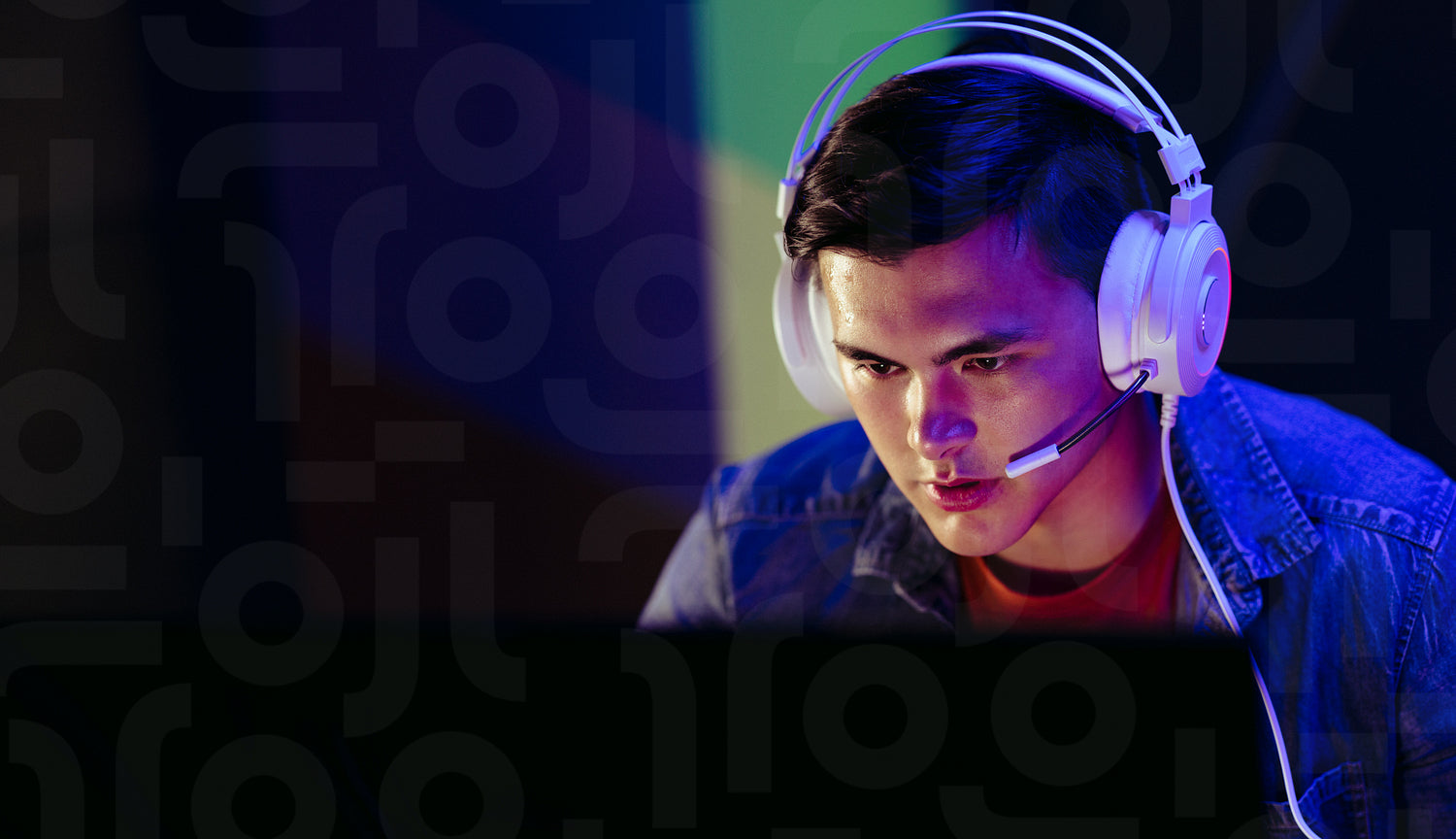 Taking on a video game with a strategy, young man looks at his gaming computer screen