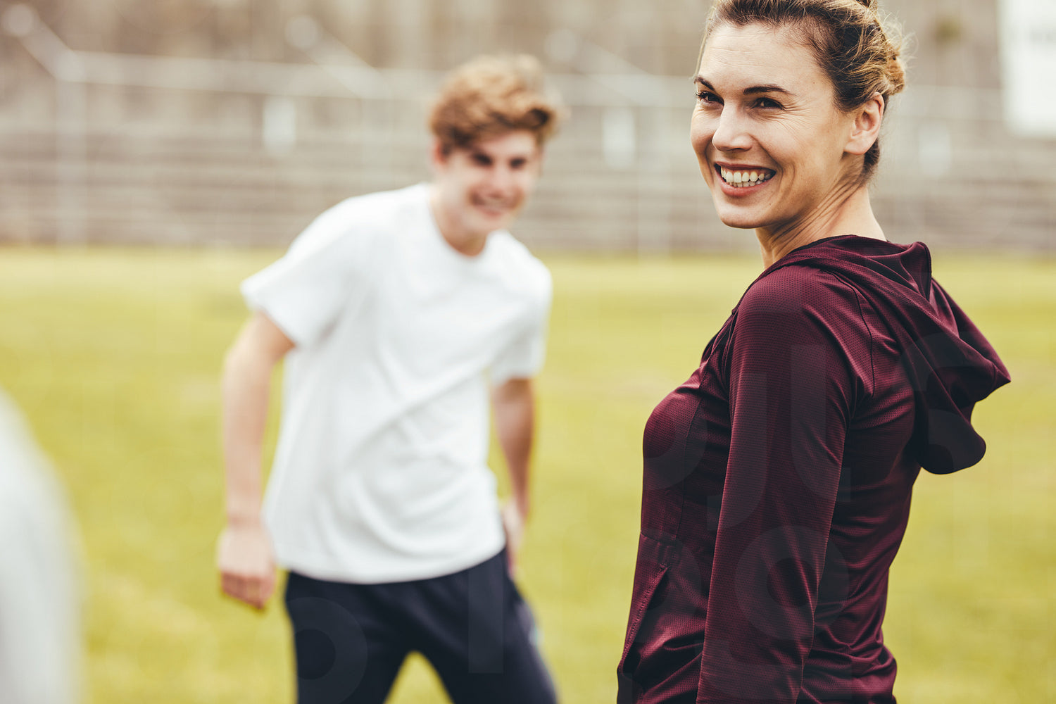 Smiling female teacher with students exercising in physical training class. Woman conducting an exercising class in high school.