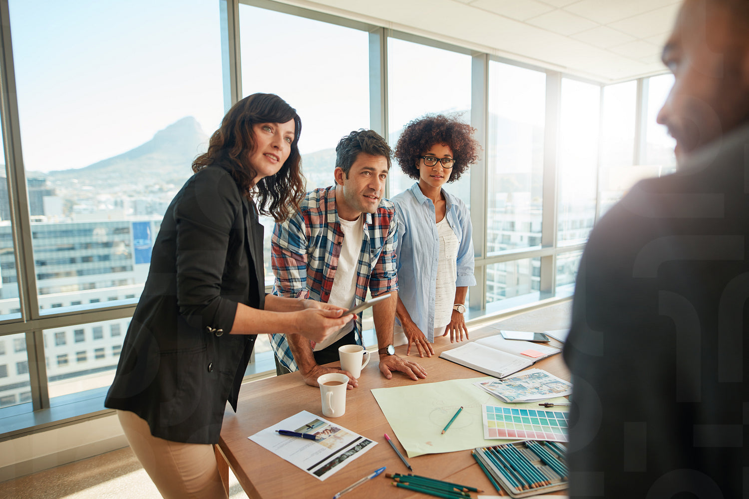 Group of young designer working together on project. Team brainstorming over new designs in meeting room.