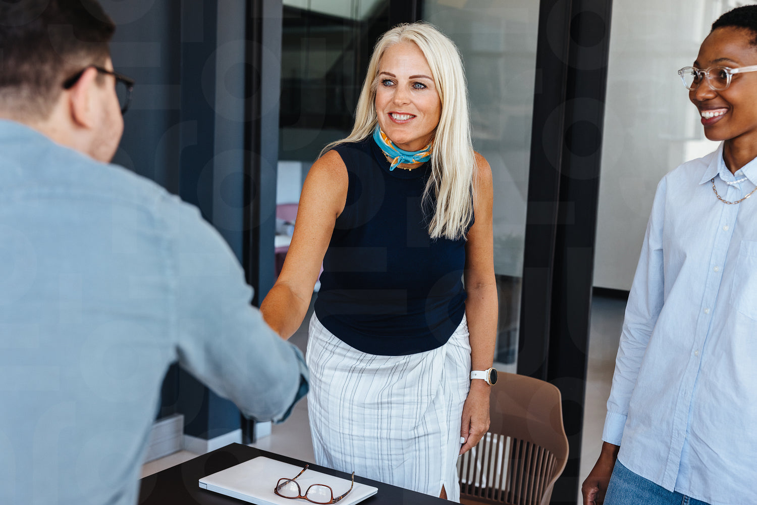 A businesswomen shakes hands with a male colleague while another female coworker stands nearby, suggesting a collaborative and professional atmosphere in an modern office environment.