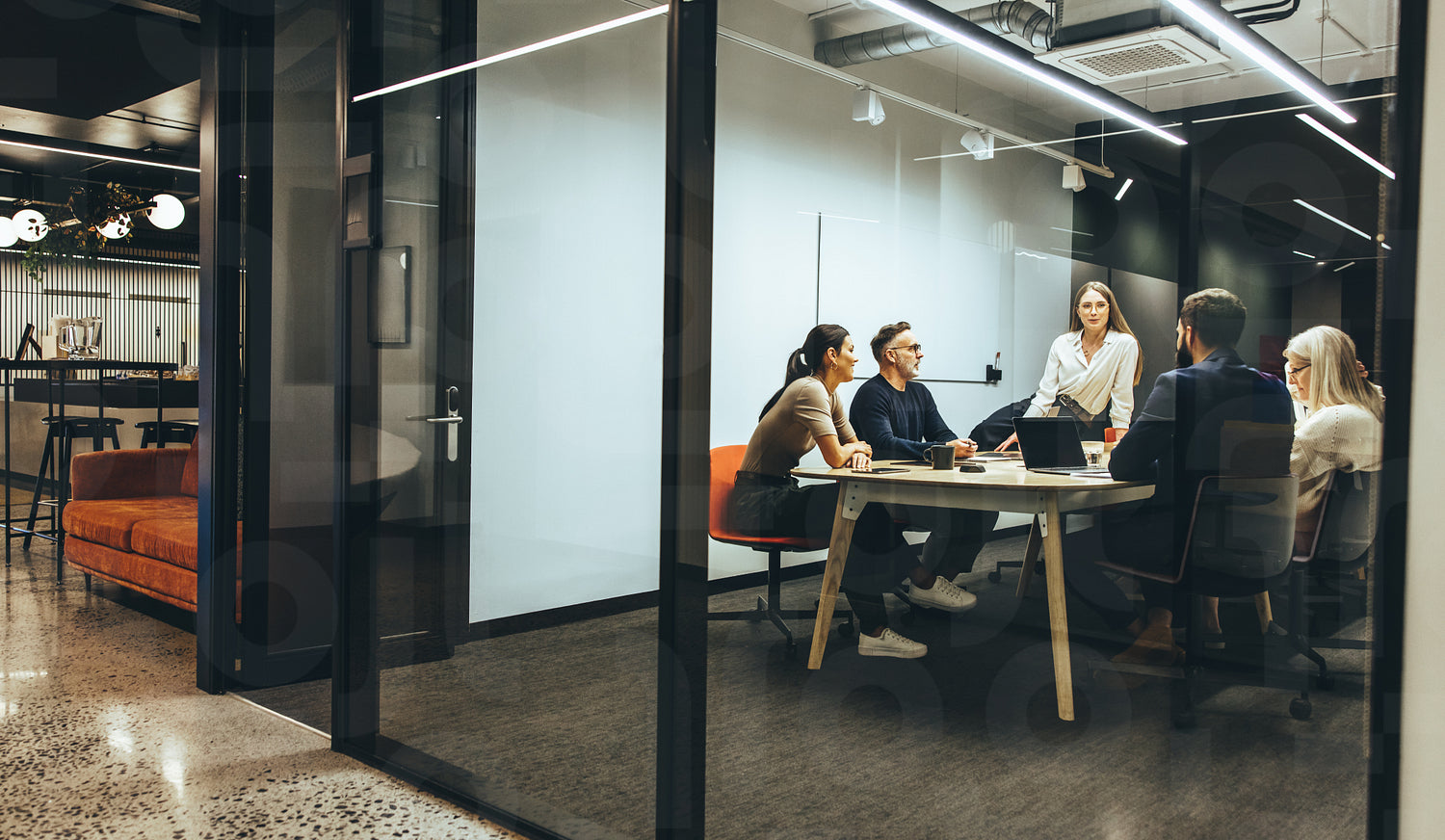 Team of diverse businesspeople having a meeting in a transparent boardroom. Group of business professionals having a discussion during a briefing. Colleagues collaborating on a new project.