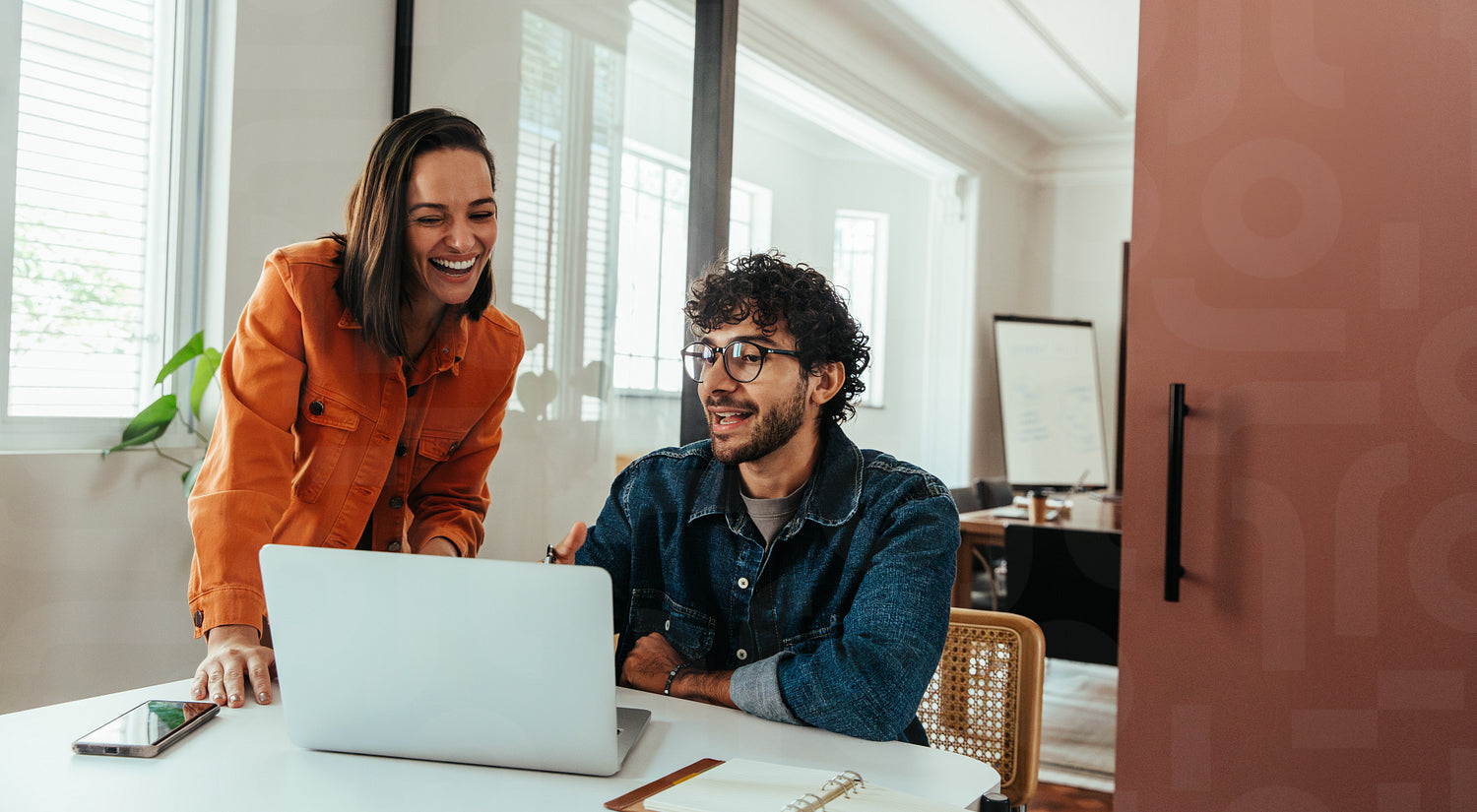 Teammates collaborating in a business discussion with a manager, working together on a laptop in a modern office environment.