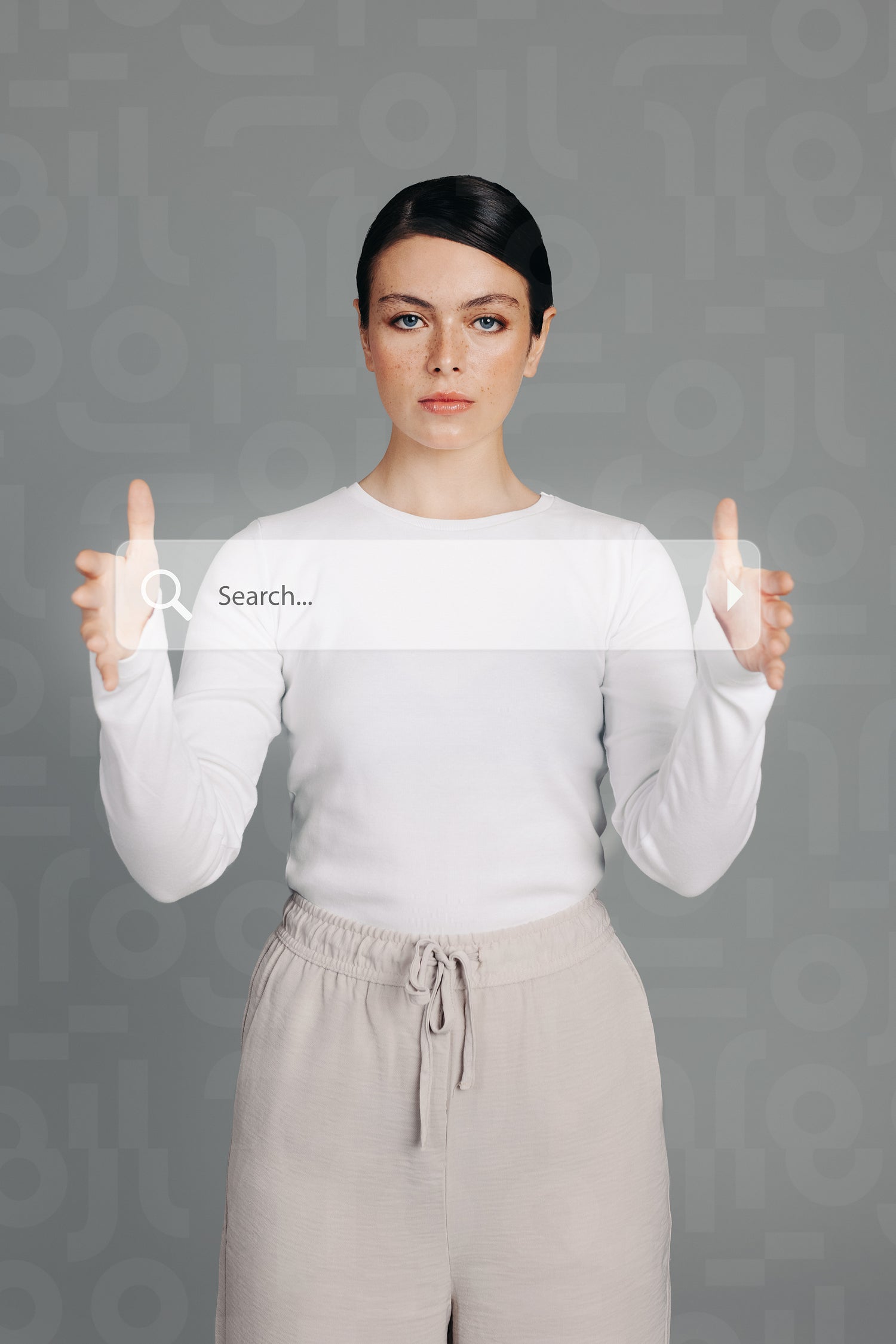 Tech-savvy woman holding a search bar icon in a studio. Young woman in her 20's recommends browsing the internet for easy access to information, as she presents the digital search field in her hands.
