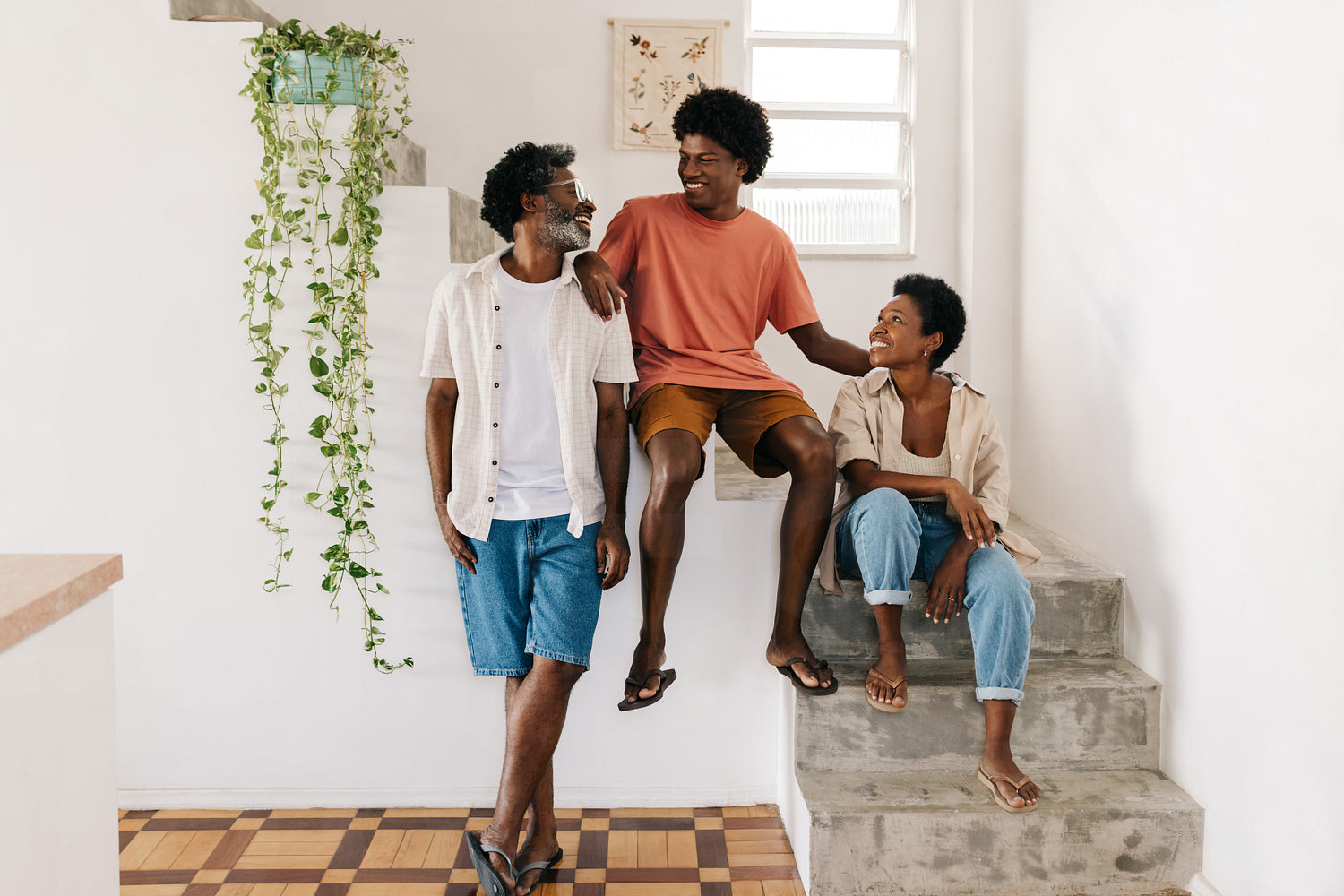 Teenage son and his parents, all with afro hair, laugh and smile together in a family moment. Happy black family relaxing by an indoor staircase, spending quality time and creating joyful memories.