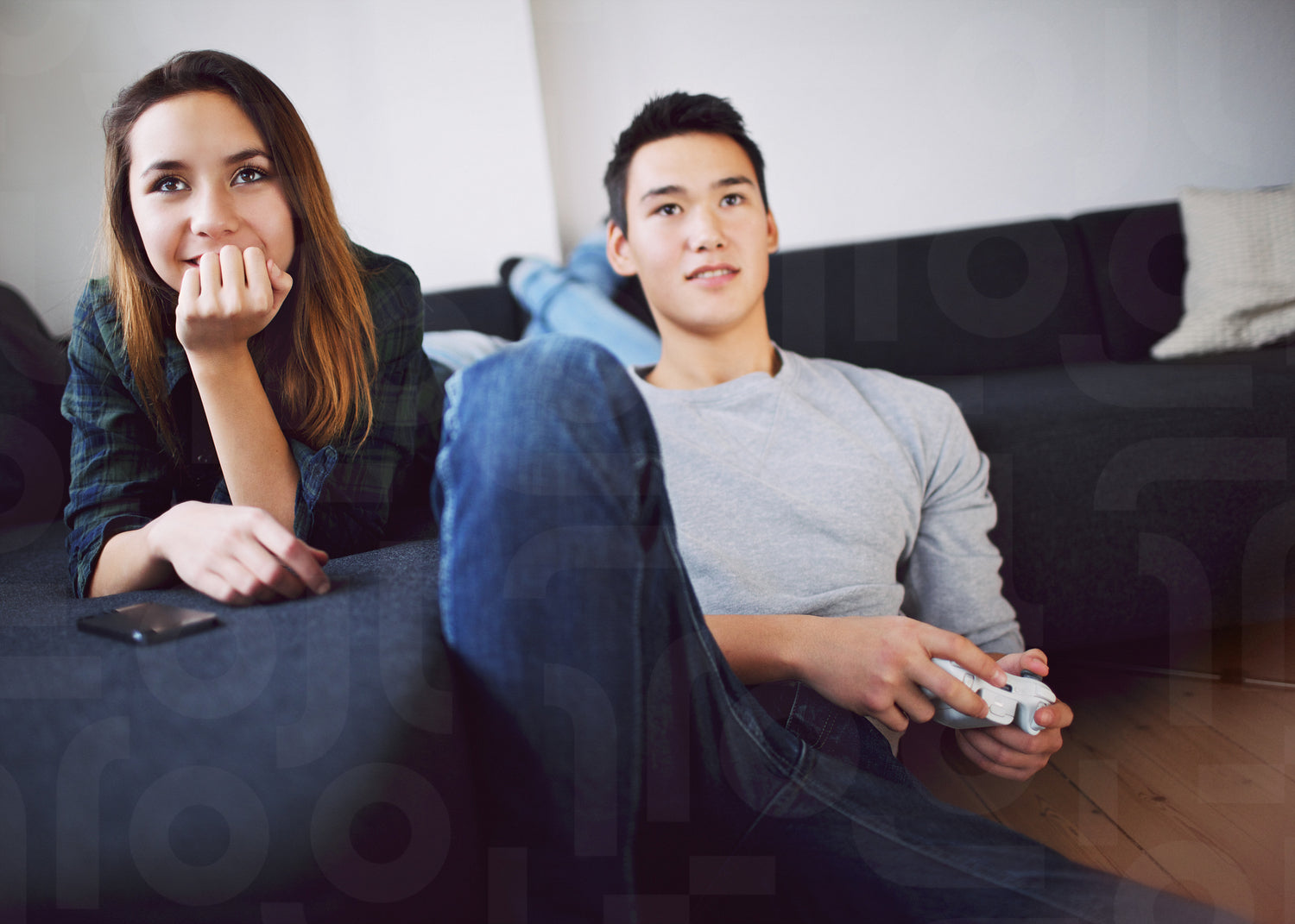 Beautiful young asian woman lying on sofa while young man sitting on floor playing video game at home. Mixed race teenage couple relaxing indoors.
