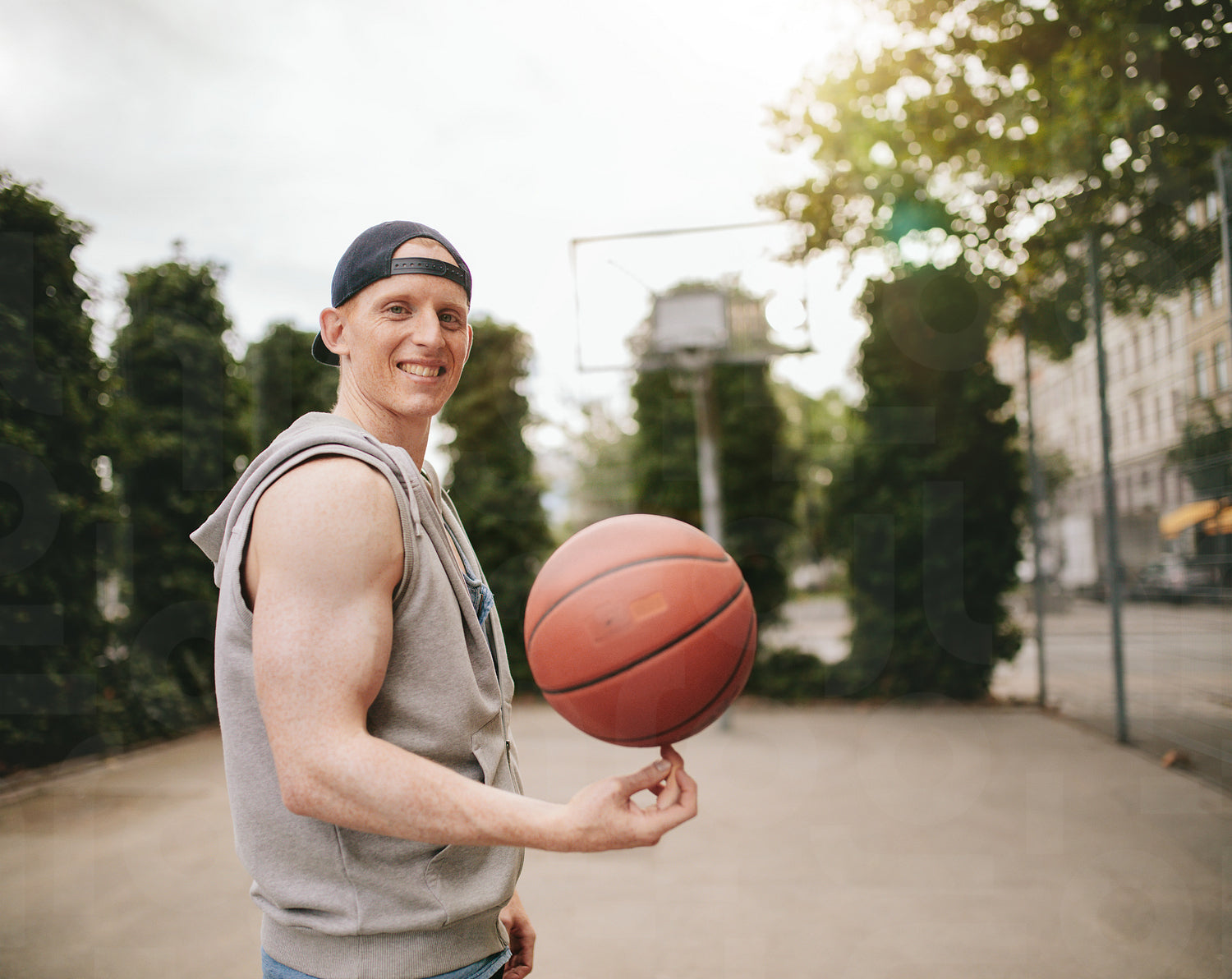 Portrait of teenage streetball player spinning the ball and smiling at camera. Happy young man balancing basketball on his finger on outdoor court.
