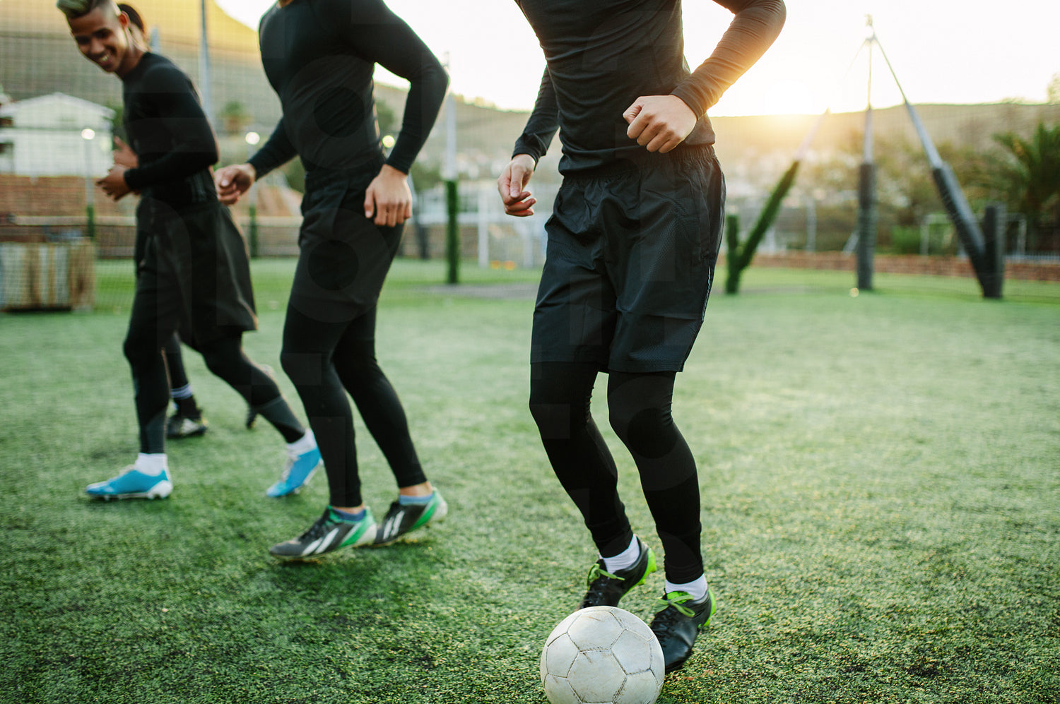 Teenagers playing football on field. Soccer team practicing on football ground.