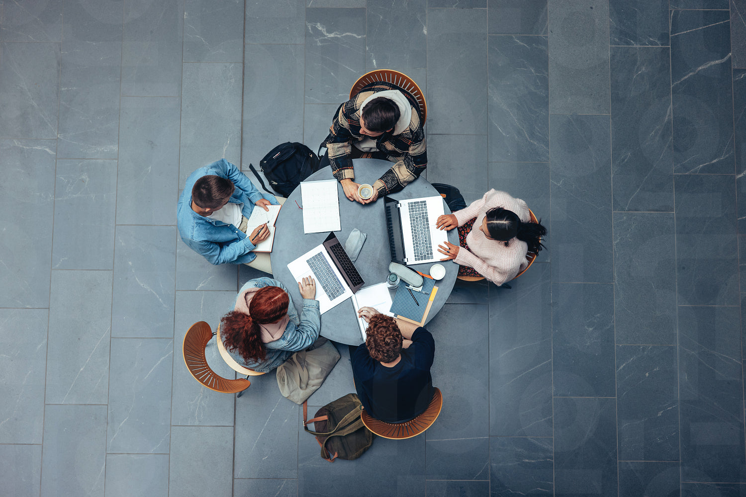 Top view of a young people preparing for exams in high school campus. Teenagers doing studies in college.
