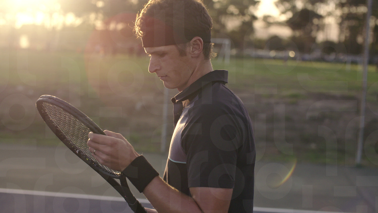 Young man in sportswear looking at his racket on the tennis court. Tennis player on hard court for playing a game.