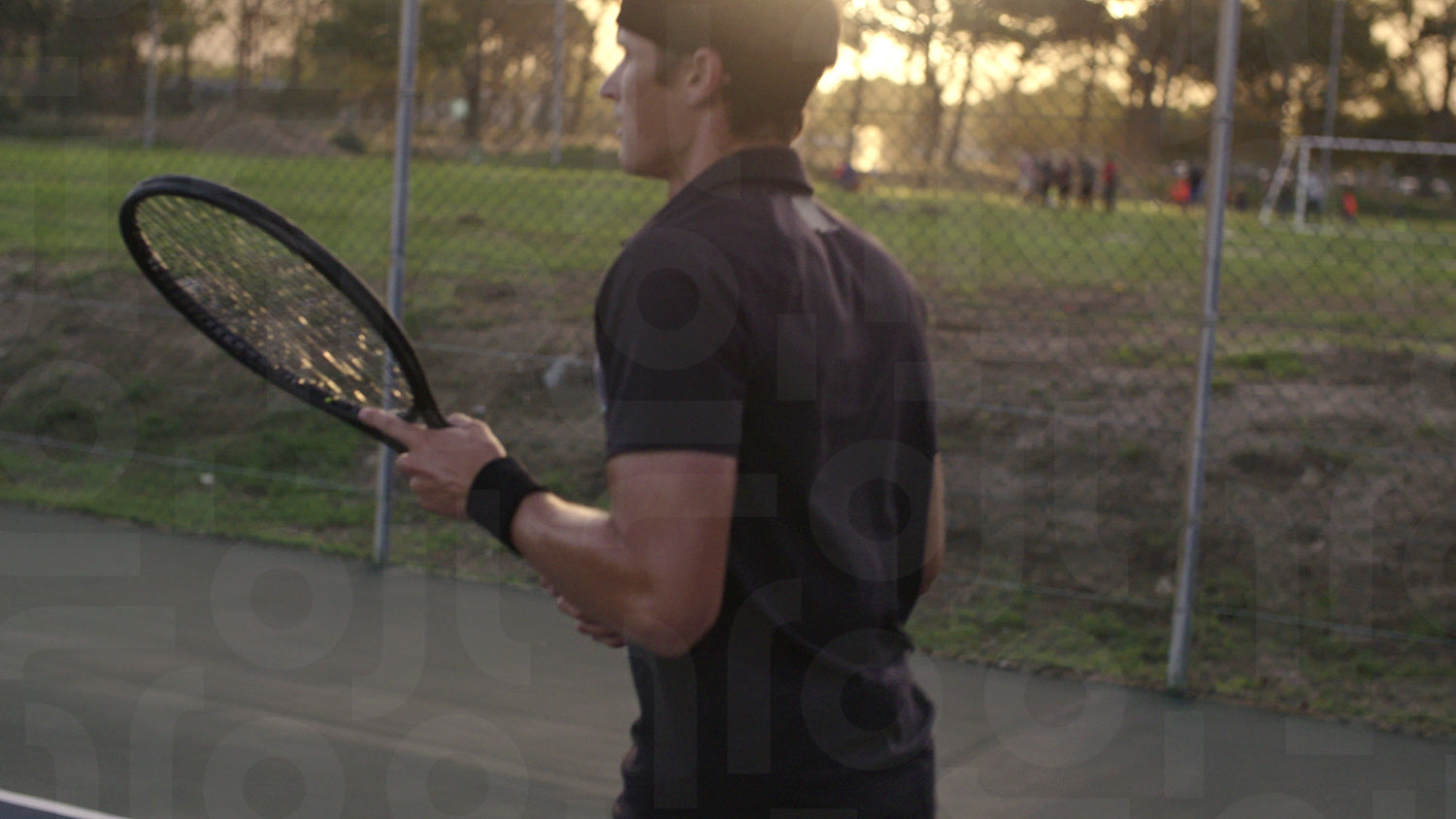 Tennis player practicing forehands from baseline on hardcourt. Sportsman playing a game of tennis on a club hard court.