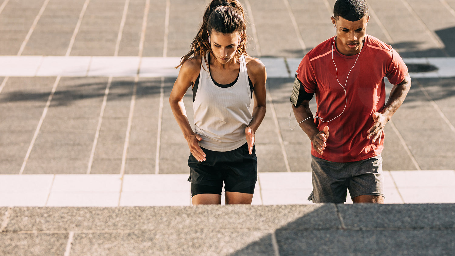 Couple in sportswear training together in the city. Sporty man and woman exercising on steps together in the city.