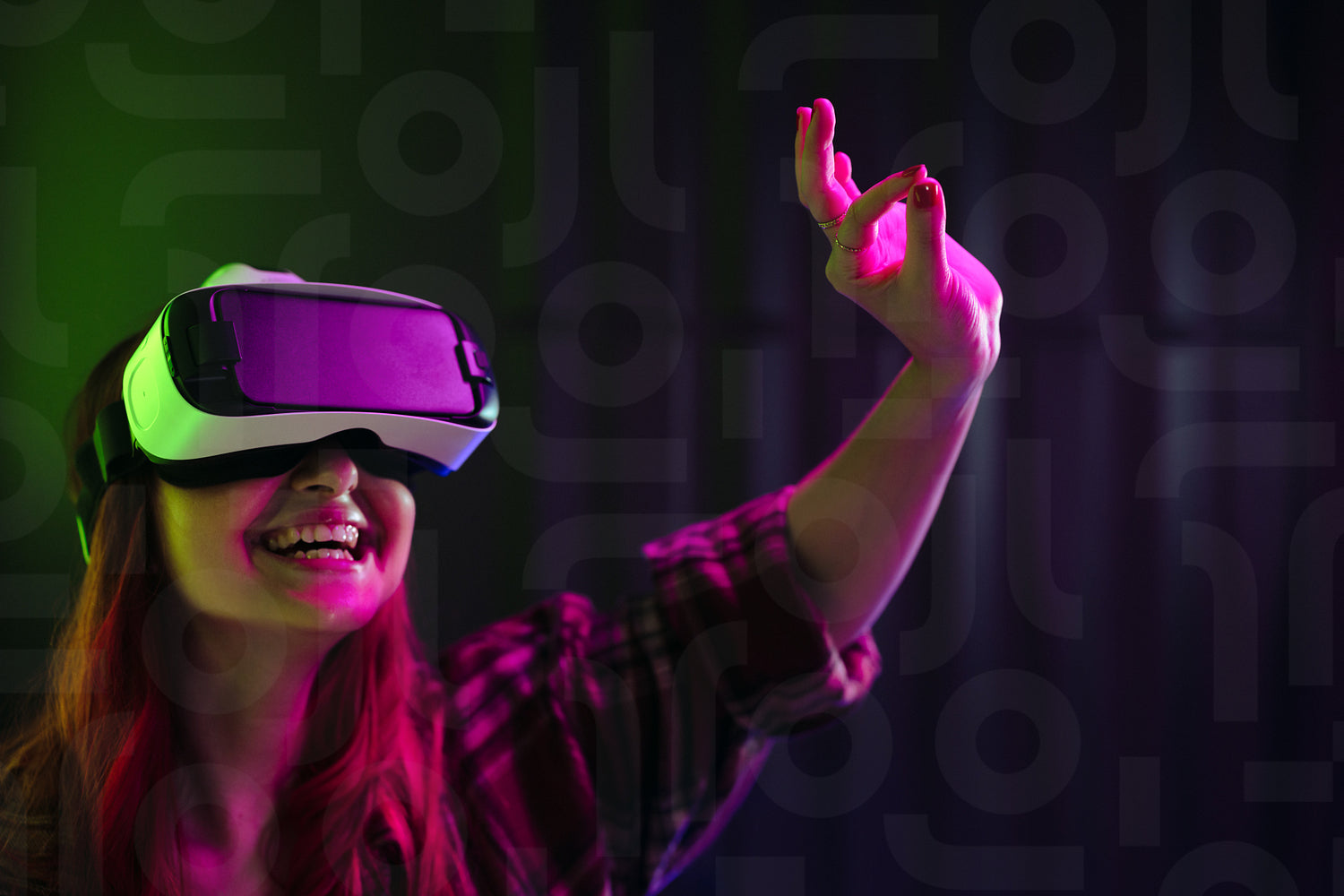 Woman smiling as she engages with the exciting world of virtual reality, showcasing the future of fun. With a VR headset on, she appears fully immersed in the immersive digital environment.
