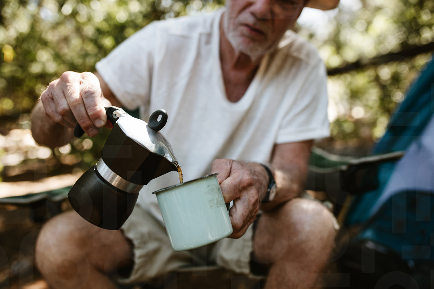 Close-up of a senior man pouring coffee in a mug at campsite. Male traveller having coffee at camping trip.