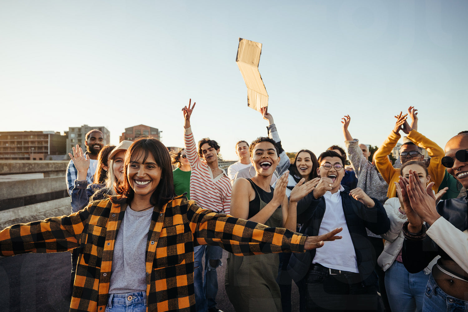 A vibrant group of individuals demonstrating together outdoors, expressing unity and optimism, united for a cause.