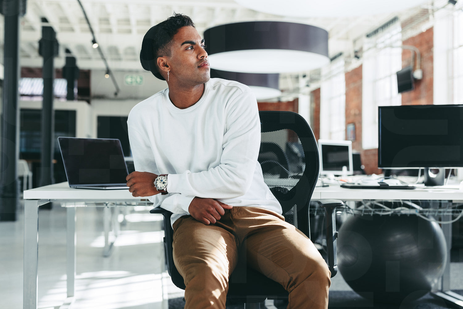 Thinking of new software ideas. Creative businessman looking away thoughtfully while sitting alone in a modern workplace. Young software developer taking a break while working in an office.