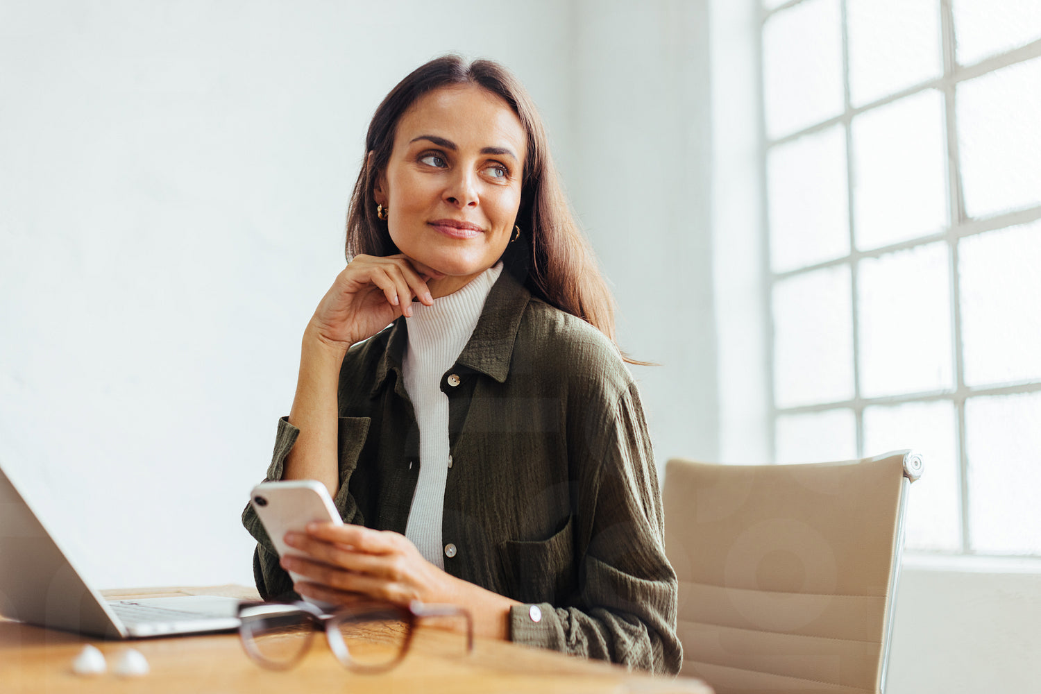 Thoughtful business woman sitting in an office with a smartphone in her hand and a laptop on her desk. Professional woman working with mobile technology in her startup.