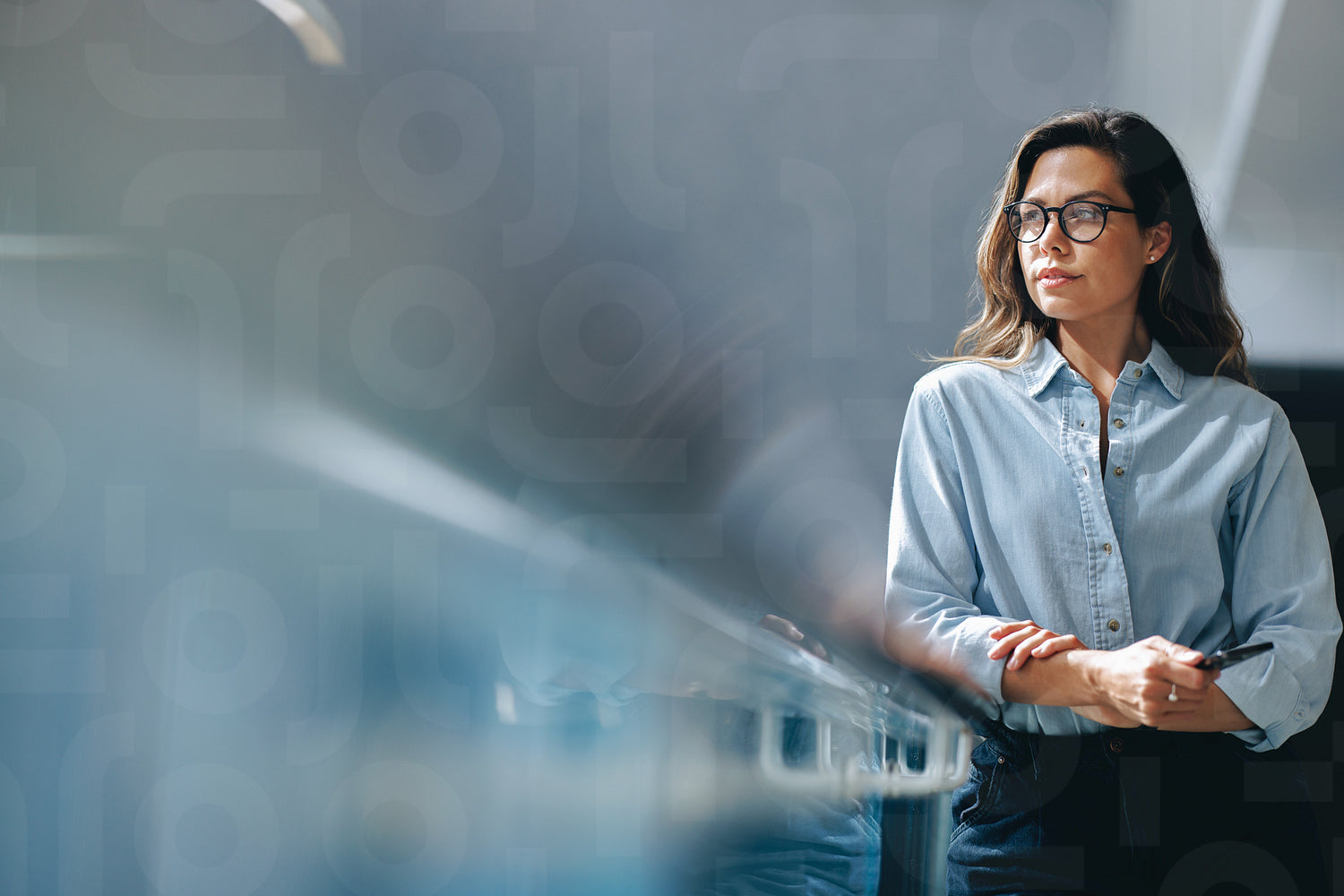 Thoughtful business woman standing on a balcony, reflecting on her goals and vision for her company