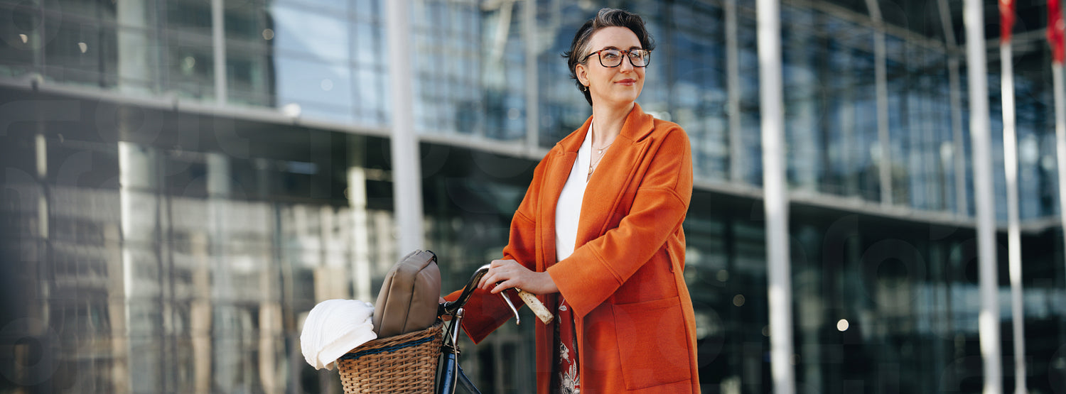 Thoughtful businesswoman pushing her bike during her morning commute in the city. Mature business woman looking away pensively while walking to work with a bicycle.